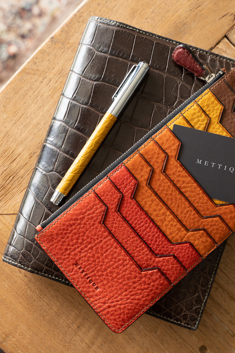 Mettique selects many types of finishing for the wild alligator skins, two of which are classics: matted and shiny, others include rubbed-off, hand-painted and sanded-off to name a few. The sturdy matted finish is more forgiving and is more water resistant. The elegant shiny finish is more delicate. Both types of finishing allow for the development of a nice patina over time. They come in many basic colors such as black and brown, as well as in an array of vivid seasonal colors.