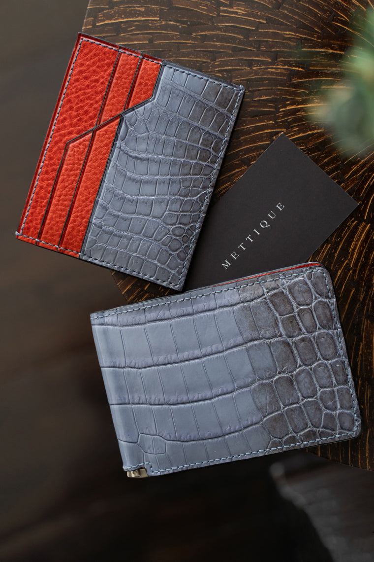 Alligator Mississippiensis leathers that Mettique sources come from the best tanneries in Singapore and France. These tanneries supply the highest quality alligator and crocodile skins for most of the world’s luxury brands. We specifically choose to work with the wild alligators, when available and suitable, as their skins are richer than the farmed alligators. Coming from the wild in the North American continent, these skins may possess some slight imperfections and are testaments to their lives in the wild environment.