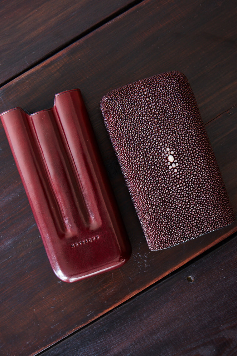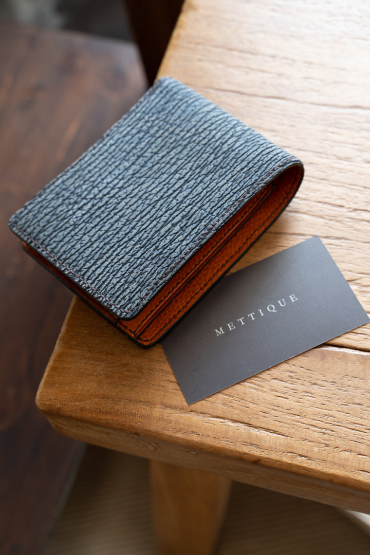 The shark skins, exclusively sourced from an Italian tannery by Mettique, come from blue shark, Prionace Glauca. These sharks inhabit the deep waters in the world's temperate and tropical oceans. They are not protected nor endangered. These skins are exceptionally sturdy and effectively waterproof. Their natural patterns are very unique and feel very arid. Because of their shape and size, these skins are suitable for smaller items. They come in solid matted and two-tone nubuck finishings and are available in a few basic colors.