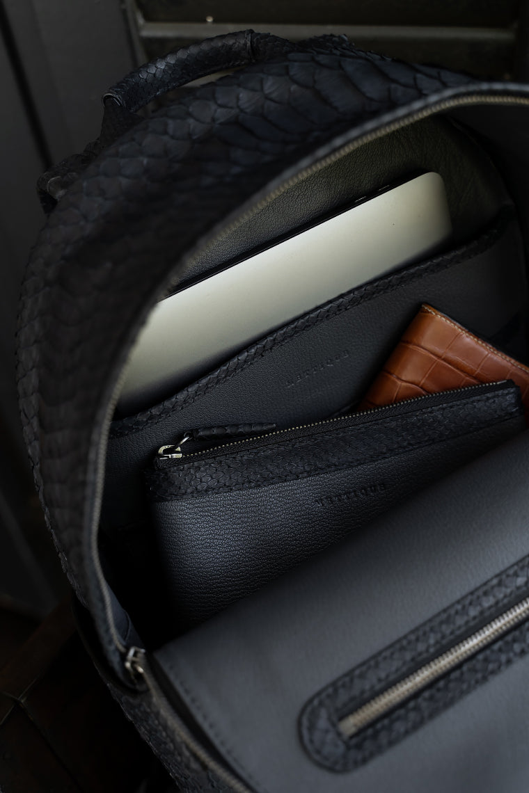 METTIQUE works with one of the best tanneries in Spain that specialize in python skins. We work with different types of finishing for the python skins which include the classic matte and shiny but also the special handpainted ones. The sturdy matted finish is more forgiving and is more water resistant. The elegant shiny finish is more delicate. Both types of finishing allow for the development of a nice patina over time. They come in many basic colors such as black and brown, as well as in an array of vivid seasonal colors.