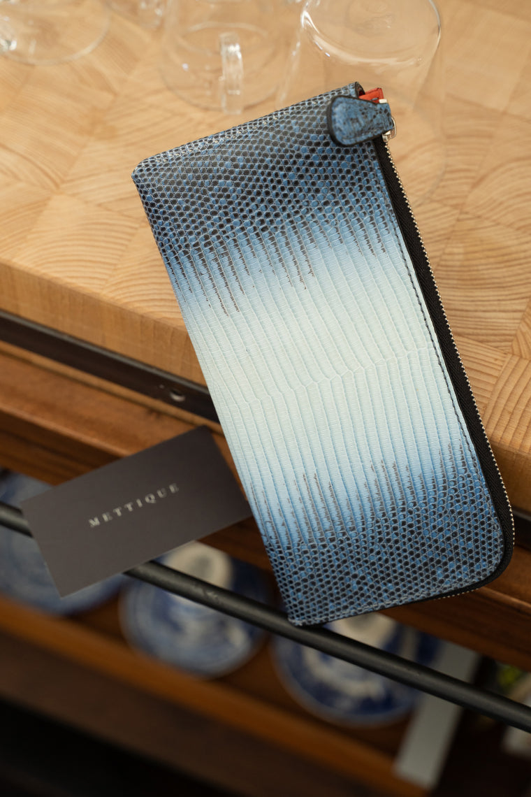 Mettique works with a tannery in Spain that supplies the highest quality lizard skins to world’s top luxury brands. These skins are treated with natural wax finish that will allow the development of a nice patina over time. They come in various types of finishing such as matted, shiny, nubuck and more. We select basic colors such as blue, as well as in an array of vivid seasonal colors such as metallic or two-tone.