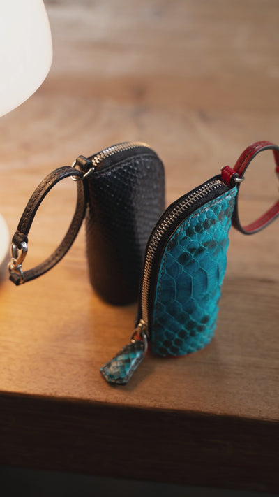 Glazed Evening ocean python with Cherry Italian vacchetta vegetable-tanned cowhide interior.