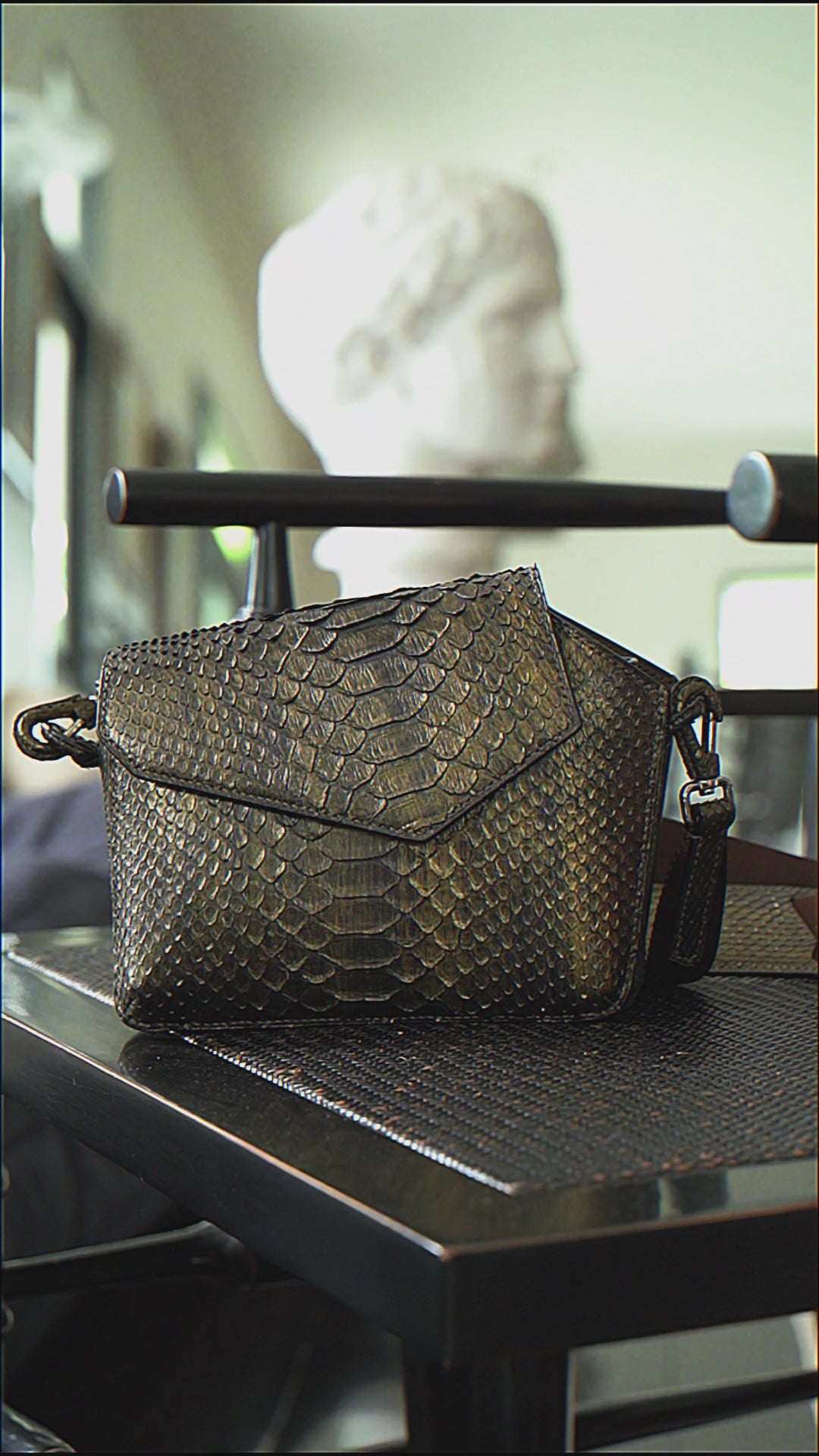 Metallic Gold charcoal python with Olive green Italian vacchetta vegetable-tanned cowhide interior.